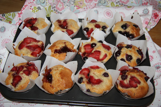 | Brisk Breakfast Muffins – some with a dollop of jam, others with fresh berries. |