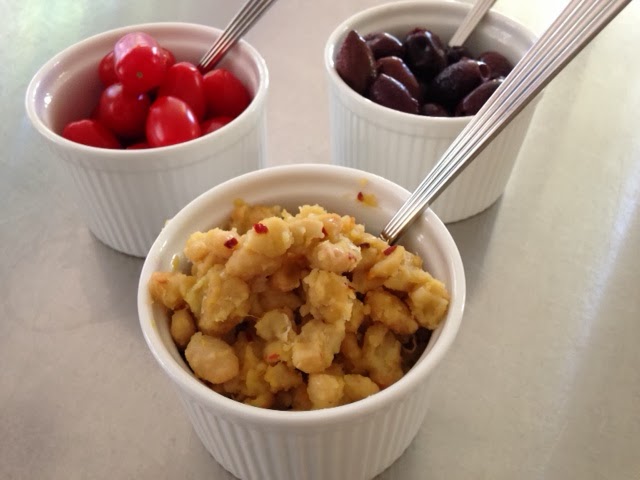 CANNELLINI BEANS pan fried in olive oil with hot chilli flakes, lemon rind and garlic. Served up with kalamata olives and sweet grape tomatoes alongside the lunchtime pasta dish.