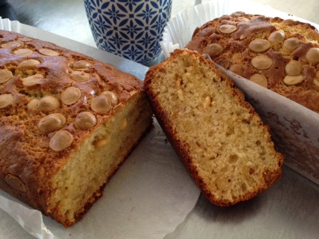 BANANA BREAD WITH WHITE CHOCOLATE is a mix and bake recipe that makes the most of any bananas past their peeling and eating fresh date. Simply combine 2 small bananas (300 grams in total) with a 300 gram tub of sour cream, 120 mls olive oil, 2 large eggs, 1 teaspoon vanilla extract, cinnamon and nutmeg to taste (I used half a teaspoon of each), 2 cups self raising flour, 3/4 cup raw organic sugar, 250 grams white chocolate chips. Mix it all together using a large fork, scrape into 2 loaf tins and bake at 180 degrees on a conventional setting for about 40 minutes. We only have a third of a loaf left…