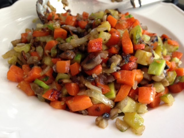 I usually grate my vegetables or chop them finely in my trusty Magimix food processor when preparing Spaghetti Bolognese. This time I felt like a heartier, textured Bolognese sauce so I diced up a vitamin charged selection from my fridge and sautéed them for 15 minutes in olive oil and butter. I combined carrots, zucchini, spanish onion, garlic, fennel, celery, mushrooms and dried Italian herbs. This is what they looked like just before I added them to the beef mince that had been browned in a separate pan. I think they look like glossy, edible gems! These veggies could also be tossed through spaghetti with a good grating of parmesan, a grind of black pepper and sea salt.