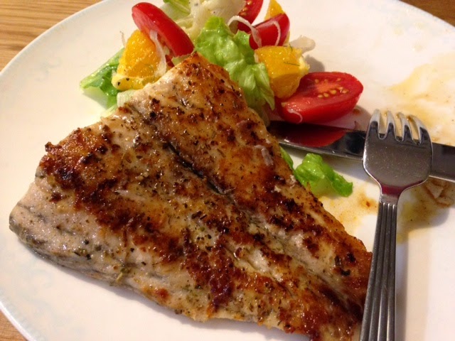 Drizzle a platter or two with all of the olive oil, half the sea salt, pepper and half the dried herbs. Place the fish skin side down on this mixture. I then sprinkled the fleshy side with the remaining marinade ingredients. I favour this method because it ensures the skin is well coated with olive oil and is ready for barbecuing.