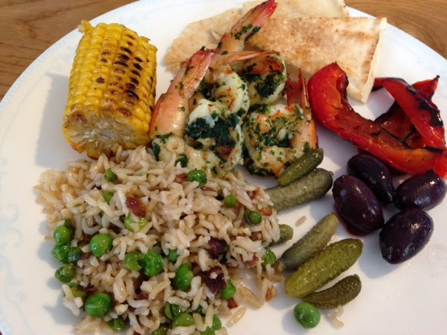 I served up a platter of these prawns with ruby red chargrilled capsicums and cumin sprinkled corn cobs, caramelised onion and fresh pea brown rice salad.
