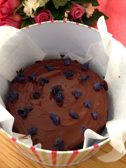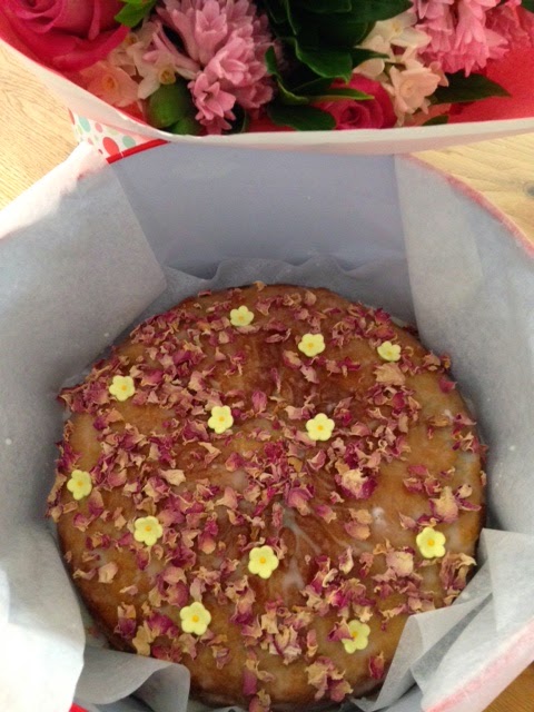 As I write this evening’s entry I can see from the corner of my eye, the carefully crafted bouquet of blush pink and white flowers that arrived today. You can spot them in the photos above. A much appreciated early Mother’s Day gift from my husband and six children. Flowers and cake are a perfect combination for this occasion.