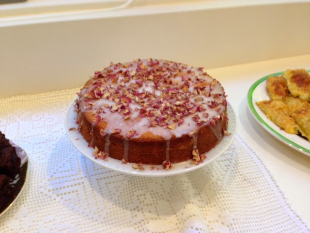 | Moist, Buttery Citrus Cake with rose petal icing resting on a crochet tablecloth that was thoughtfully hand-made by my late grandmother, Baba Joka. |