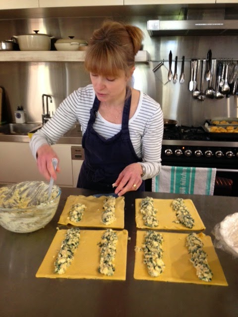 In a large frypan sauté the onions and garlic in olive oil over a low heat until softened. Add the English spinach and stir until wilted. Remove from the heat and allow to cool. This step is important. If you add a warm mixture to the cheese and then try to fill the pastry, it will become very soft and difficult to handle.
