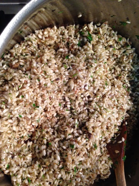 When the prawns are done, reduce the heat to medium, add the rest of the butter and a little more olive oil and pour in the rice. Stir this around so that the grains become covered with the rich buttery-brown mushroom bits at the bottom of the pan as pictured below. Keep stirring until the rice starts to turn opaque and just starts to catch on the pan.