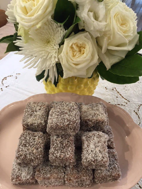 Classic moist Lamington cakes looking pretty on a vintage pink platter that once belonged to my late grandmother and extraordinary home cook, Baba Joka.