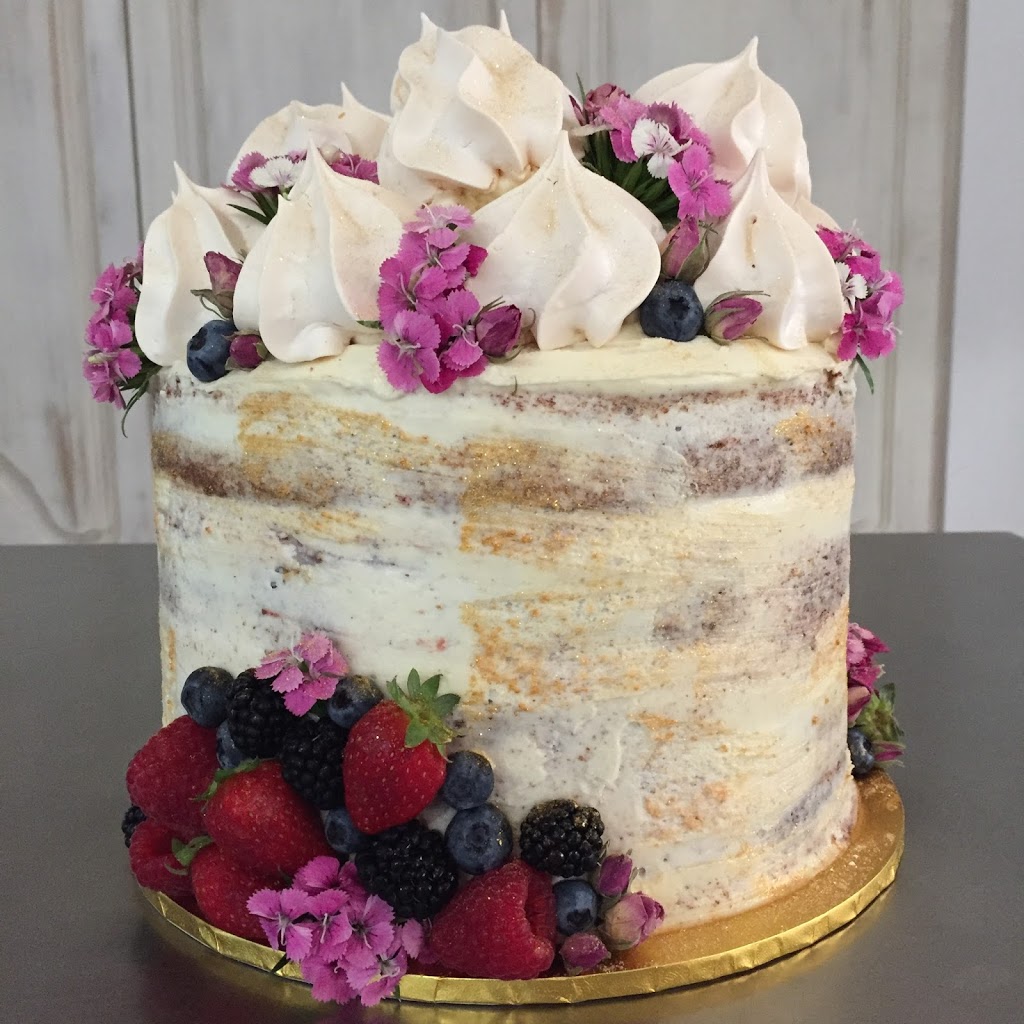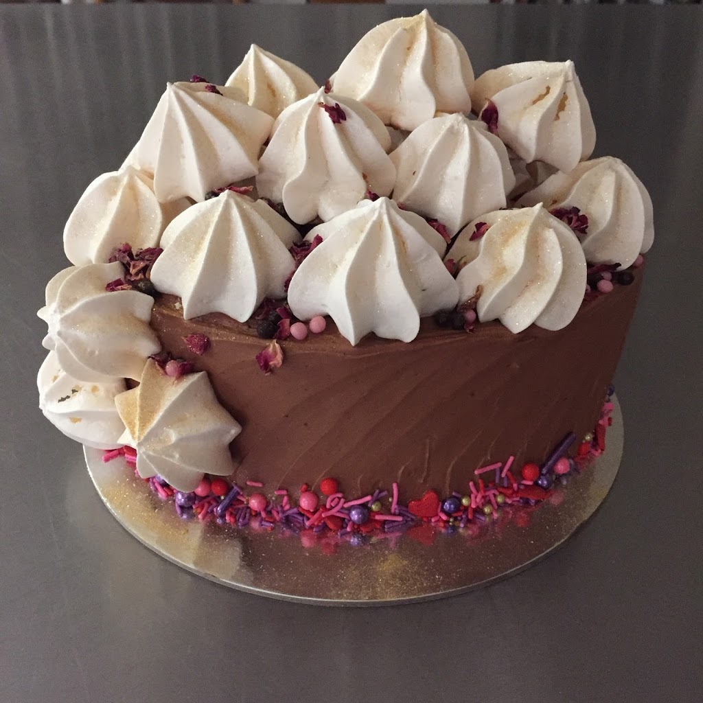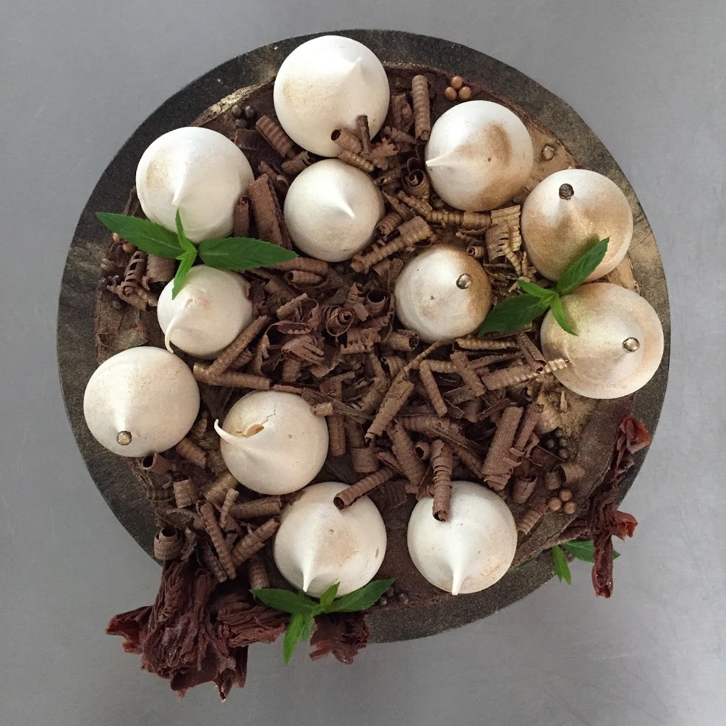 Four layer vanilla chocolate marble cake, Madagascan vanilla buttercream, meringues