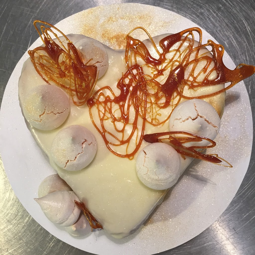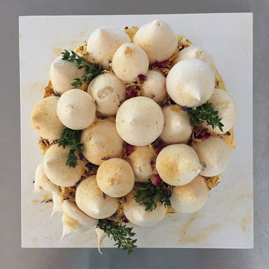Moist lemon cake, hug me tight icing, toffee, meringues