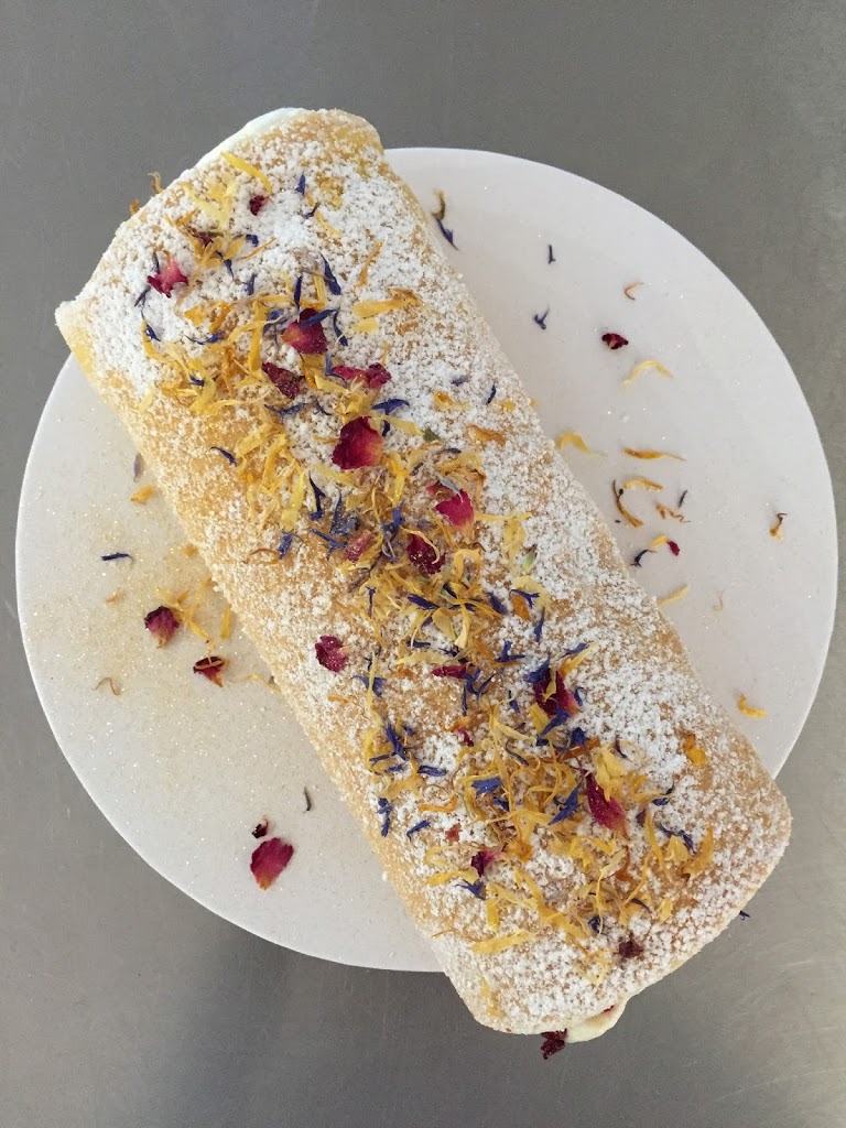 Field flowers vanilla Swiss Roll, creme fraiche creme, berry jam