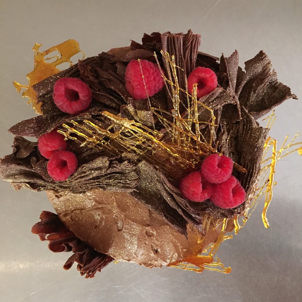 Chocolate sour cream cake, golden syrup icing, raspberries
