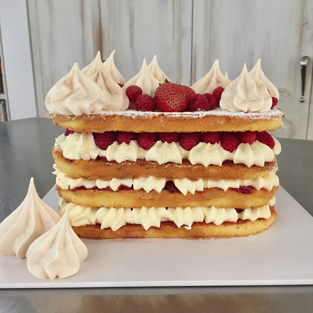 Classic vanilla bean Victoria sponge, vanilla creme fraiche, berries, jam, meringues